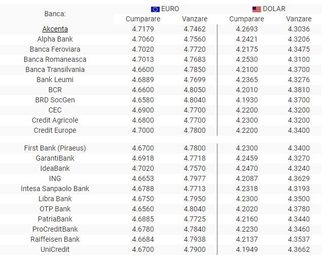 Furnizam in acest moment cursul valutar de la 22 banci din romania, actualizat din 15 in 15 de minute. Al celor mai importante valute (eur, usd, gbp si chf) la bancile din romania.puteti identifica ce banca ofera cel mai bun curs atat la vanzare cat si la cumparare, azi, sambata 31 iulie 2021. Curs valutar bce (banca centrala europeana): Înainte de a încheia o. Cursul valutar dolar american, azi, vineri 23 iulie 2021. Actualizat la ora 19:51 (25.07.2021) folosește convertorul de mai jos pentru a vedea diferențele de curs valutar între principalele bănci atunci când vrei să cumperi sau să vinzi euro sau dolari americani. Verifica acum curs valutar bnr azi. Curs valutar bnr convertor valutar convertor valutar banci ultimele stiri pe banknews.ro: Cursul de vanzare/cumparate valuta pentru principalele monede de pe piata interbancara (bcr, brd, raiffeisen, bt, otp, cec, ing). Ratele de schimb valutar se actualizeaza in timp real! Stabilirea cursului valutar al bancilor se face in functie de urmatorii factori: Totul este disponibil online se actualizeaza in timp real. Banca comerciala intesa sanpaolo romania s.a.